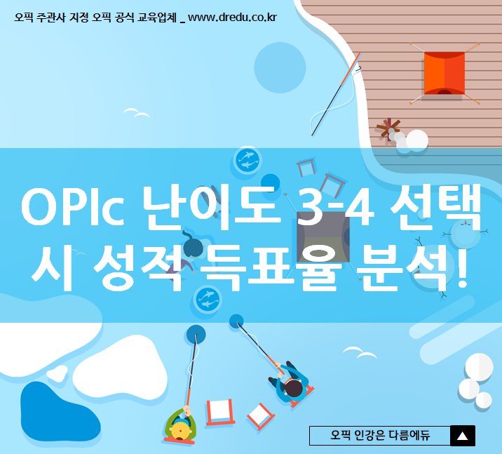 | 오픽(OPIc) 인강 - 난이도 5-6 선택 시 성적 득표율 분석! (0) | 2019.05.22 |
